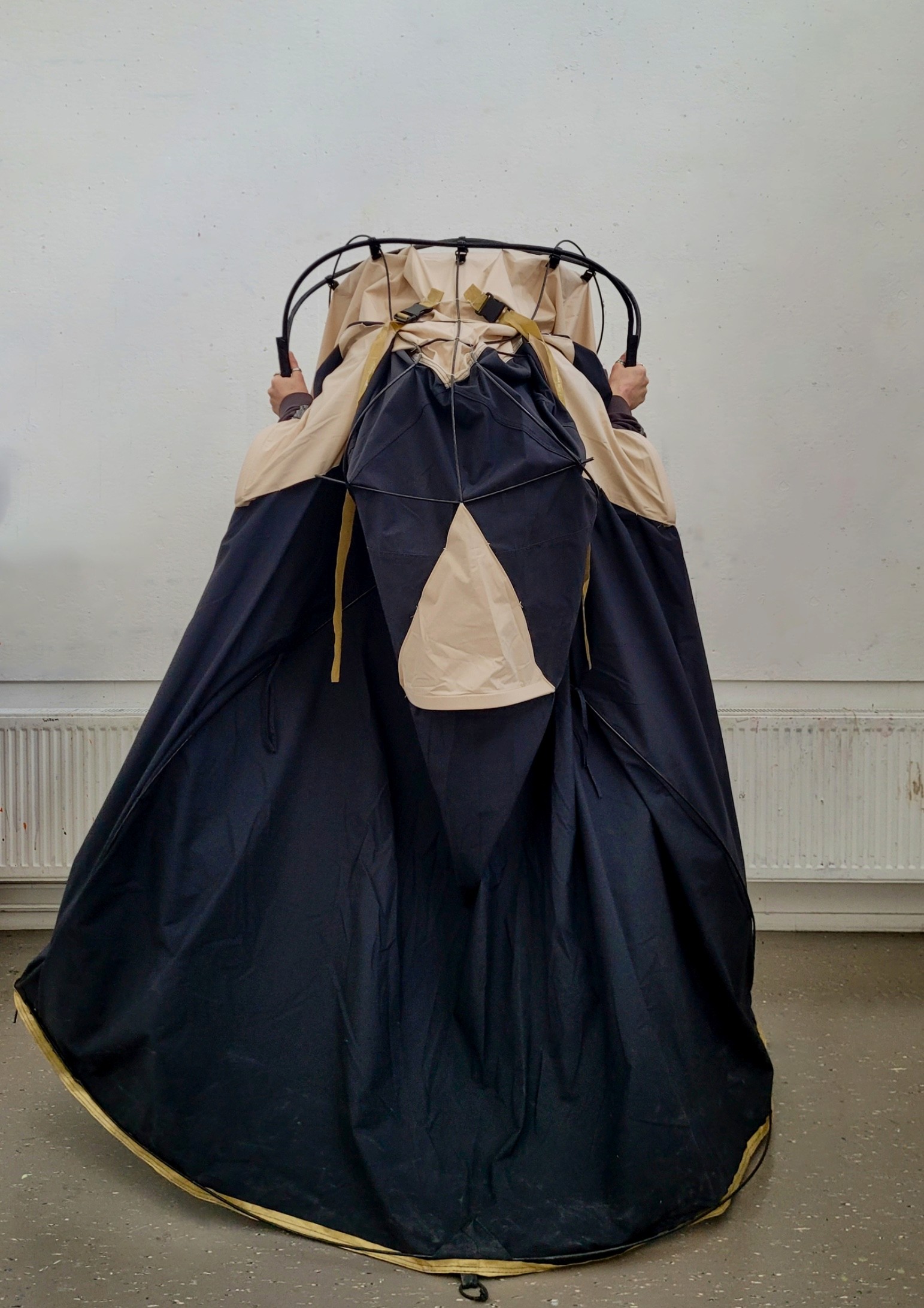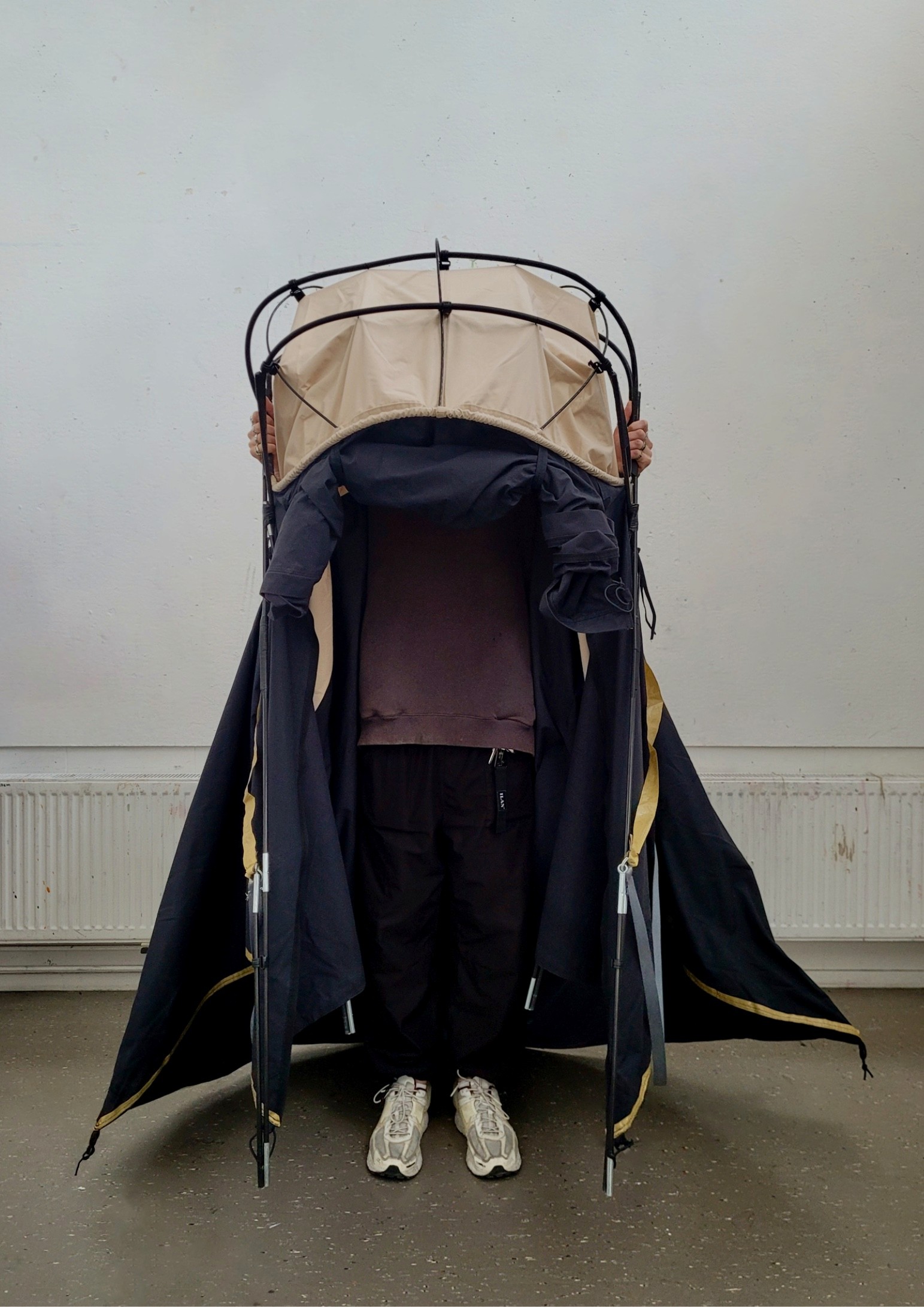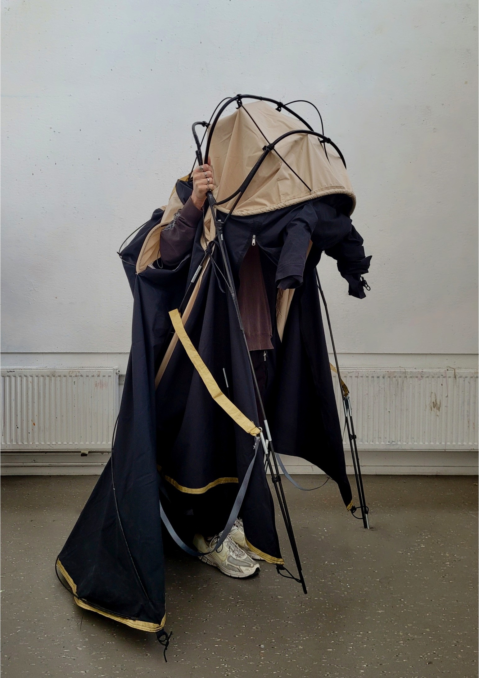 Portable tent jacket, unfoldable and transportable.